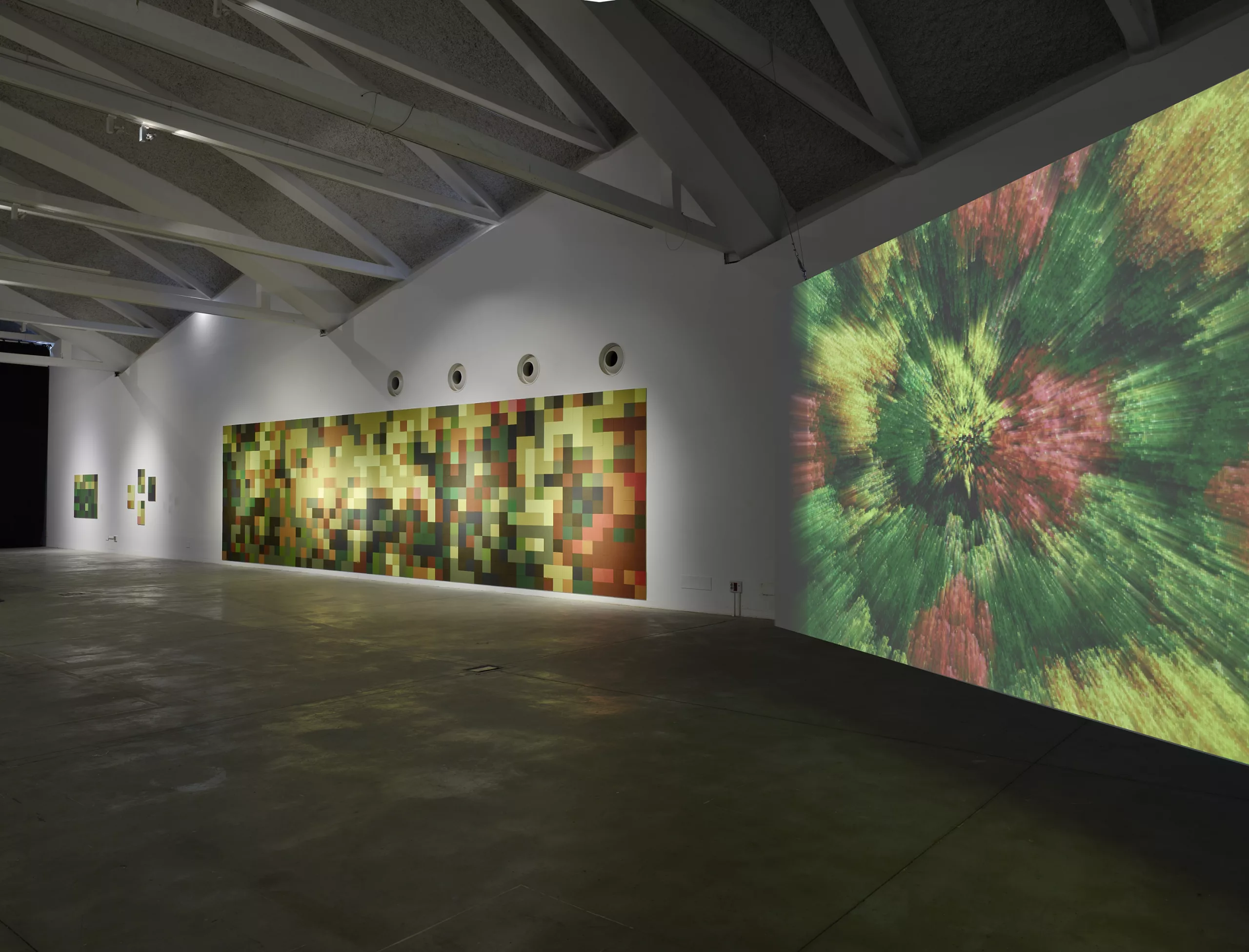 Pixelated Forest uses digital technology alongside traditional artistic expression. On the one hand, the pixelated image of a computer-generated forest, composed of a palette of only 15 colours for a total of 120,000 pixels, is transformed into an immersive visual experience when projected in large format. On the other hand, each of the pixels becomes a hand-painted monochrome work, moving from the digital to the physical to celebrate the individuality of colours and the diversity of the ecosystem. This exhibition shows a small part of the entire project.
