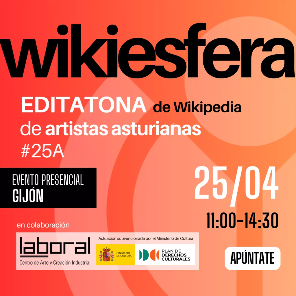El próximo 25 de abril de 11:00 a 12:30 h, en LABoral Centro de Arte celebramos la actividad «Editatona de mujeres asturianas», organizada por Wikiesfera y subvencionada por el Ministerio de Cultura en el marco del proyecto “Creación de comunidades de conocimiento libre con enfoque feminista”.
