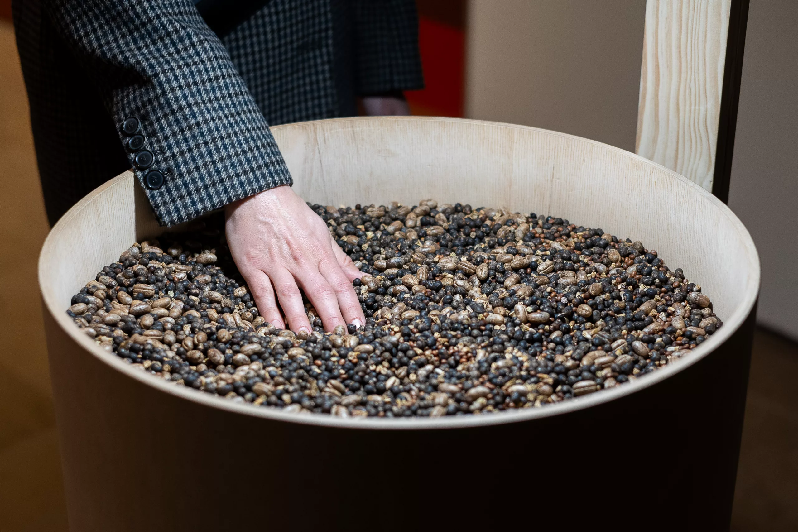 Semillas Digitales. Digital Seeds ofrece una experiencia multisensorial donde los visitantes, al tocar las semillas que contiene un recipiente de madera, generan artificialmente árboles que crecen en tiempo real mediante tecnologías de detección táctil y algoritmos de arte generativo. Esta interacción simbólica refleja nuestra relación con la naturaleza y cómo nuestras acciones, por pequeñas que sean, pueden influir en el entorno. A medida que los visitantes continúan tocando las semillas, los árboles se desarrollan en formas únicas y variadas, reflejando la diversidad biológica del mundo natural.
